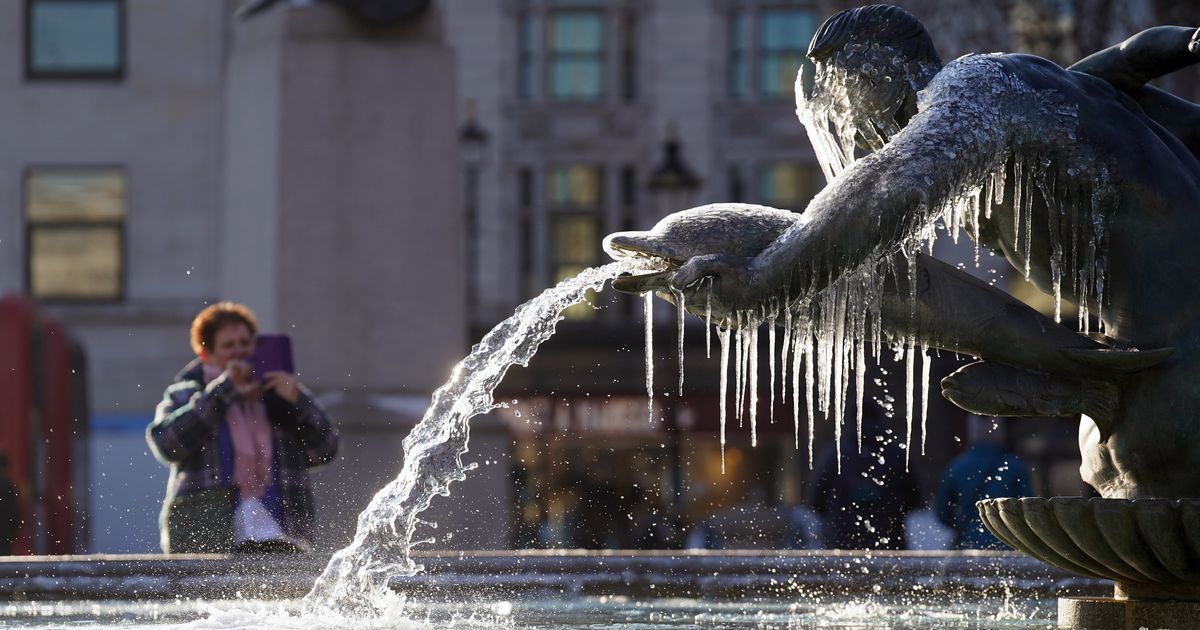 The Arctic blast was evident across the country on Friday as the fountains at London’s Trafalgar Square were frozen and heavy snow disrupted travel and led to school closures in Scotland.